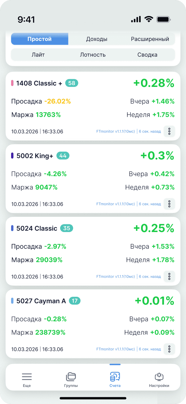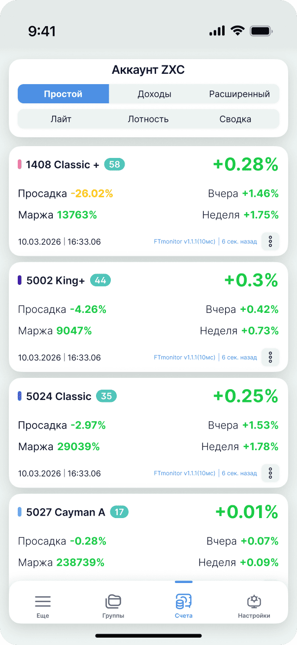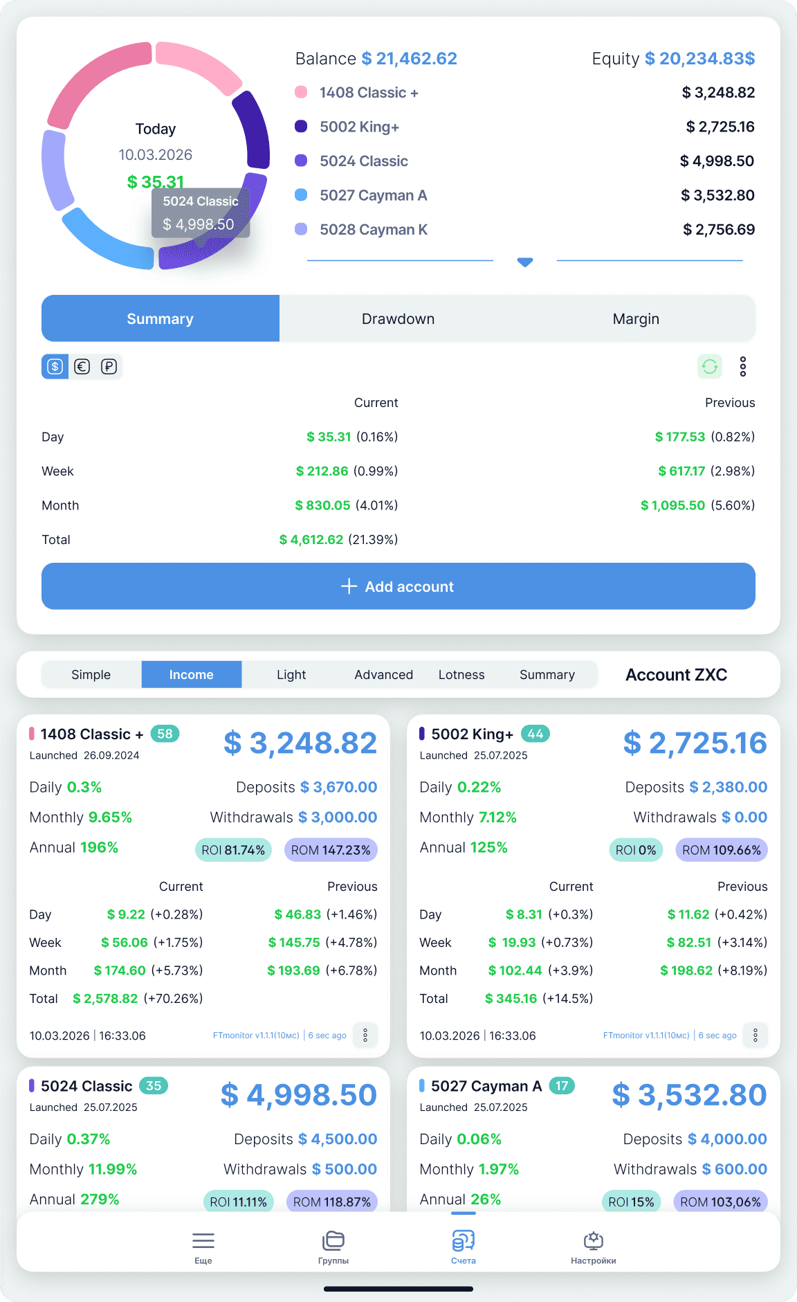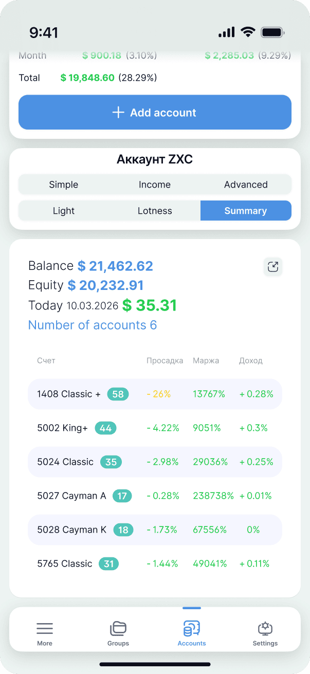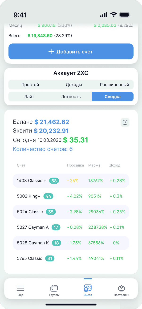 Объединяйте счета в категории или создавайте общие папки для наблюдения за торговыми результатами коллег и друзей
