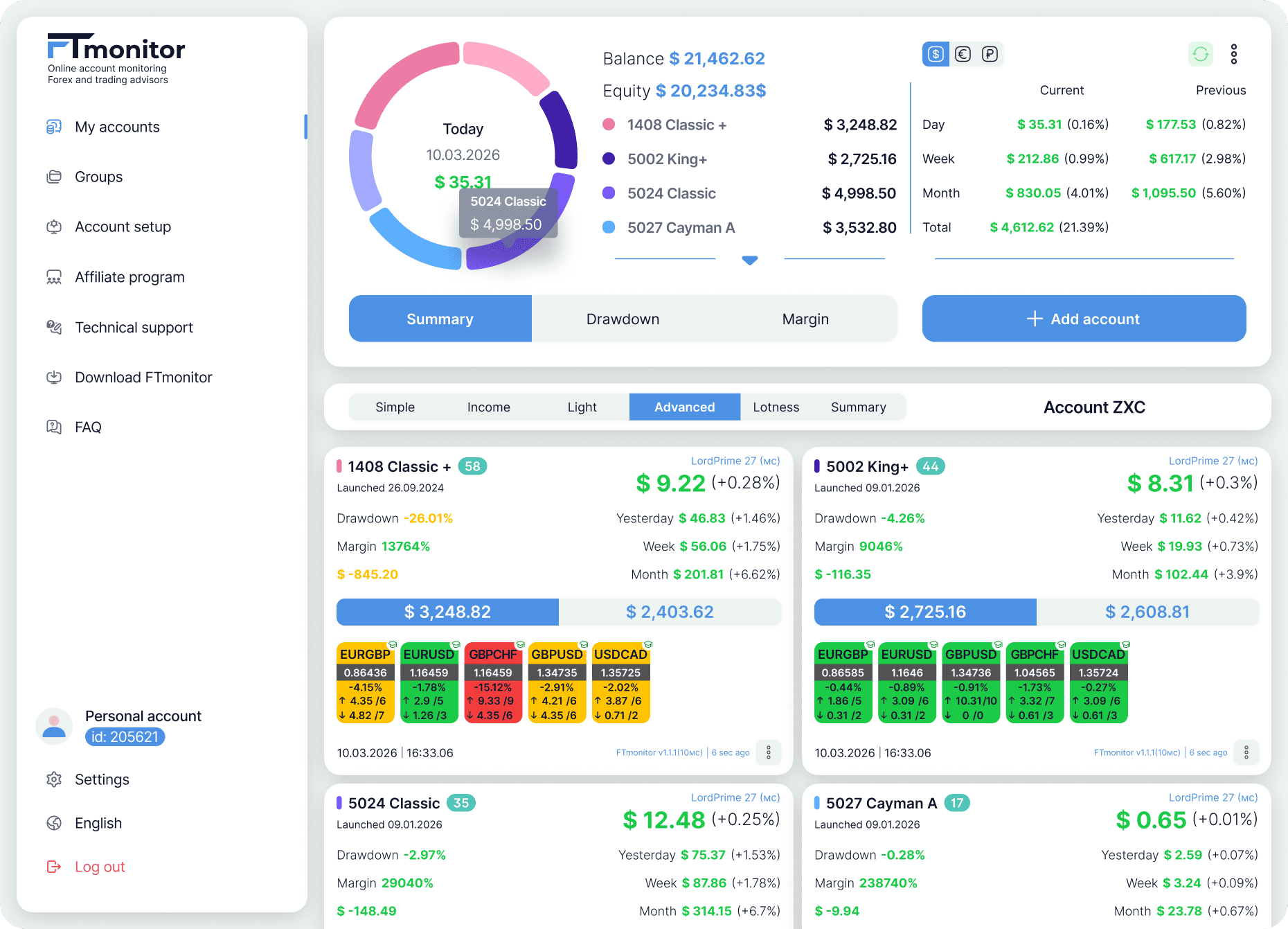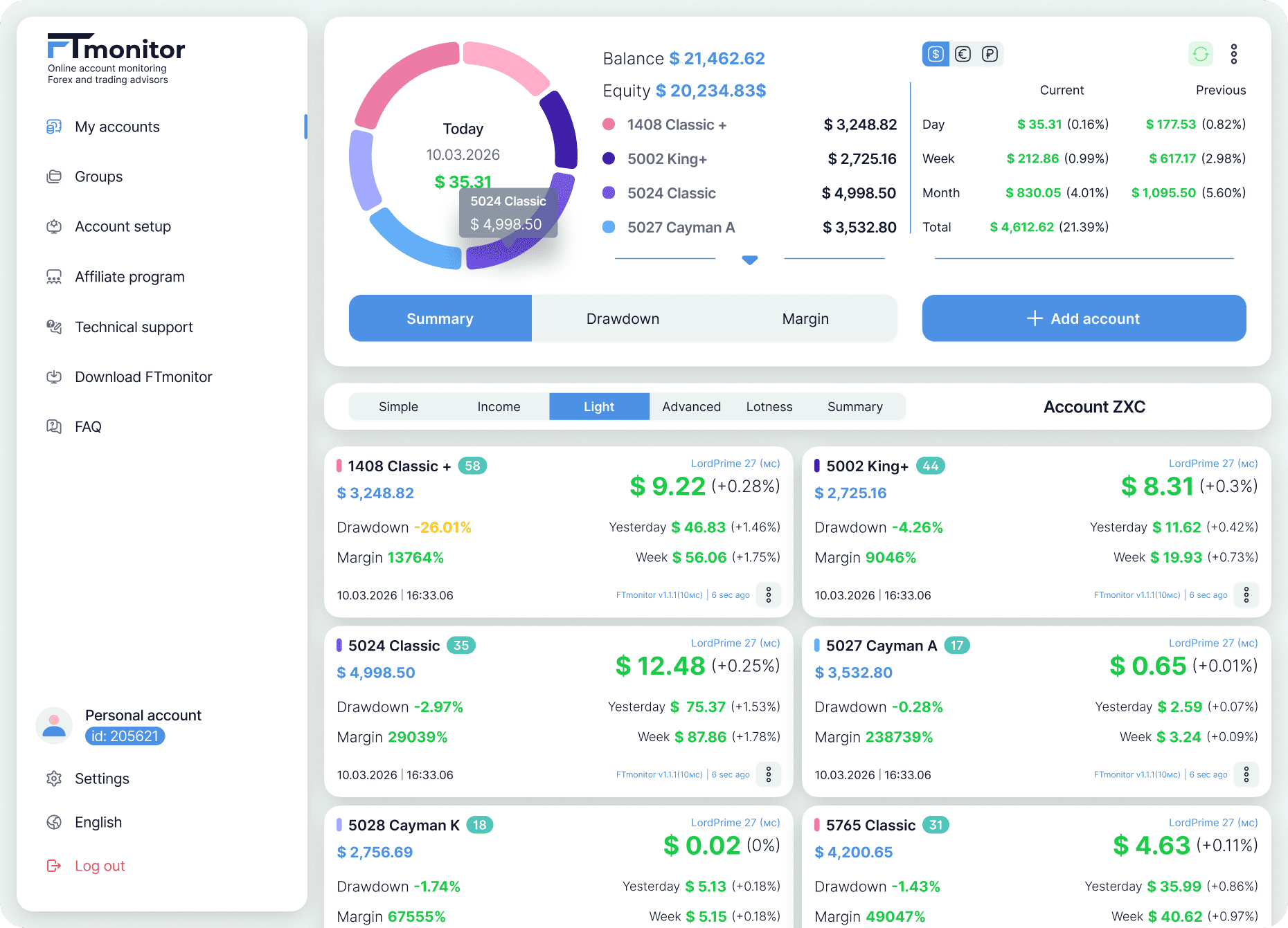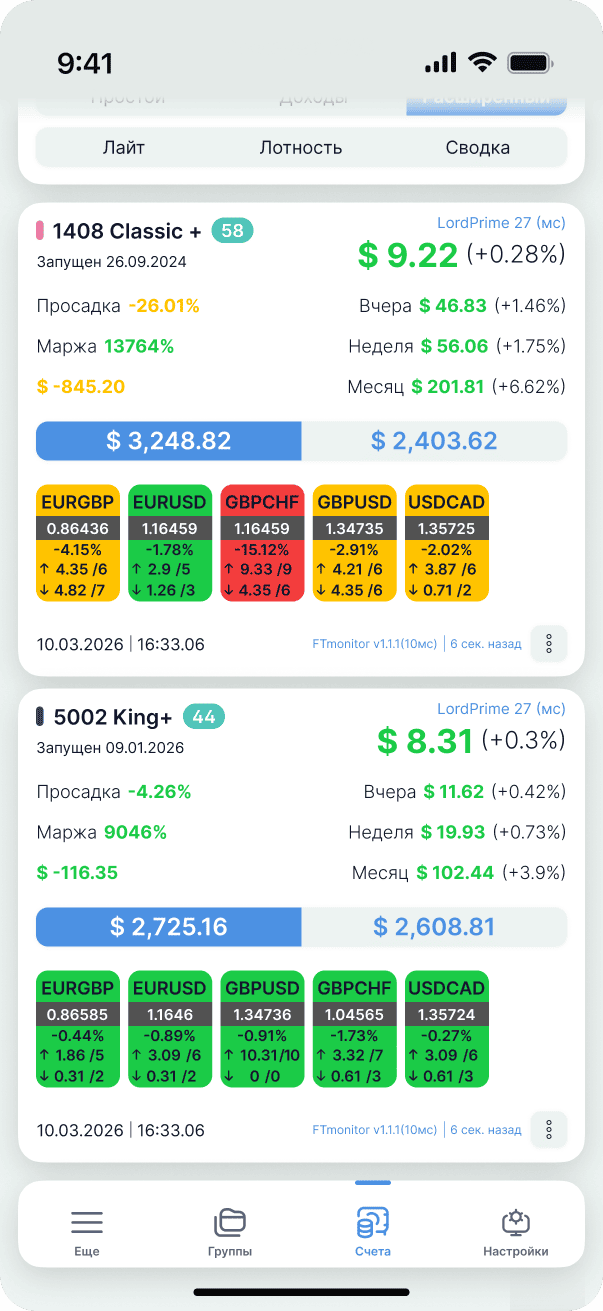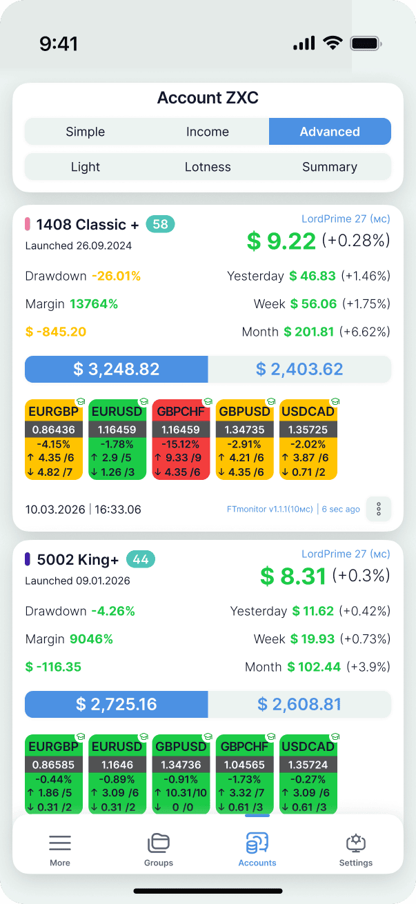 Объединяйте счета в категории или создавайте общие папки для наблюдения за торговыми результатами коллег и друзей