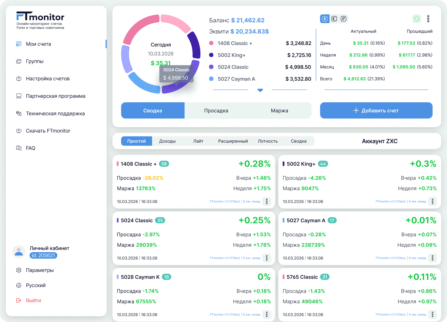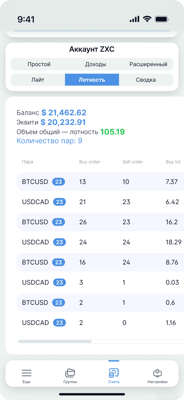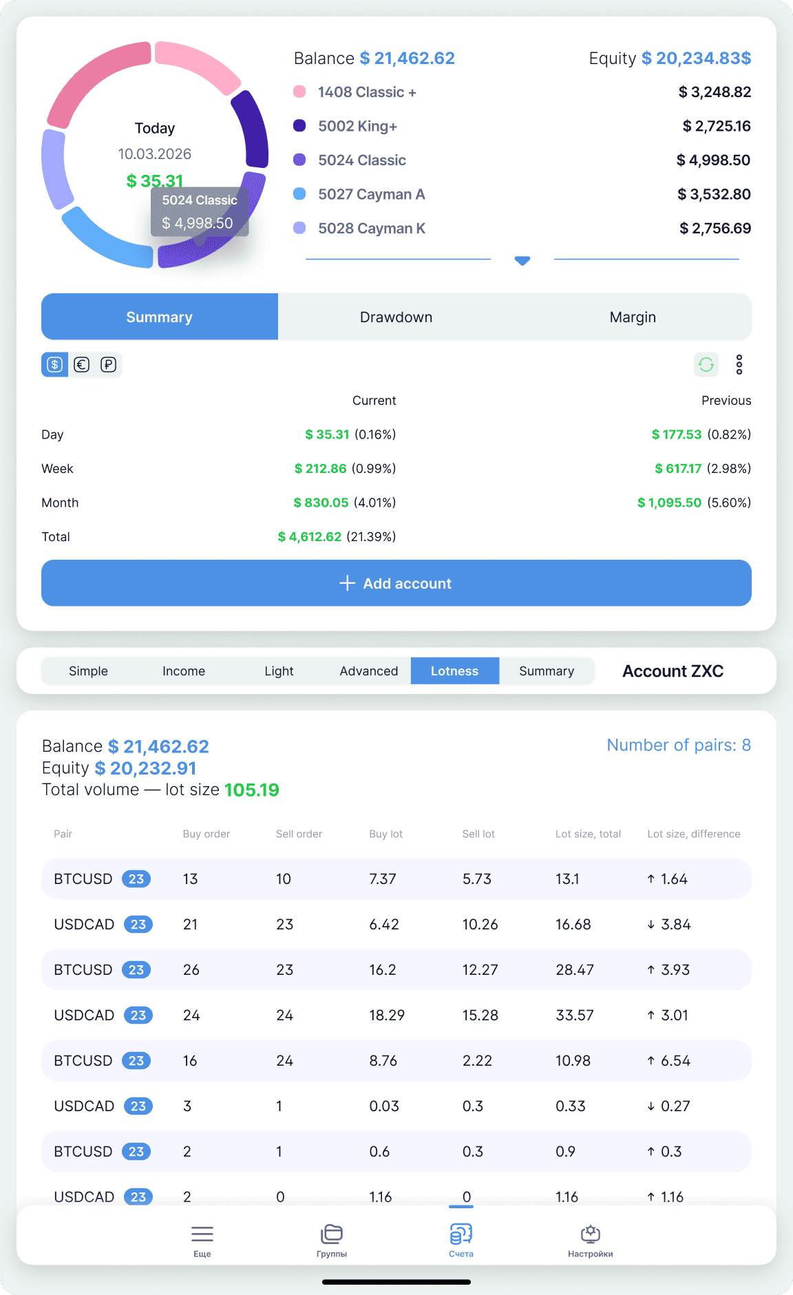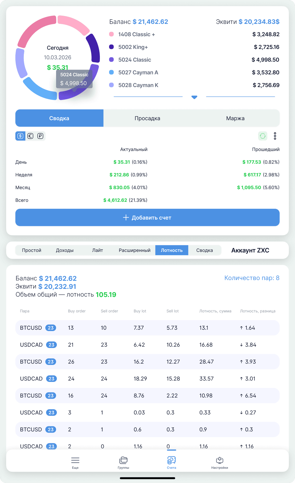 Система мгновенно пересчитывает баланс, эквити и текущую прибыль в удобную для вас валюту по актуальному рыночному курсу