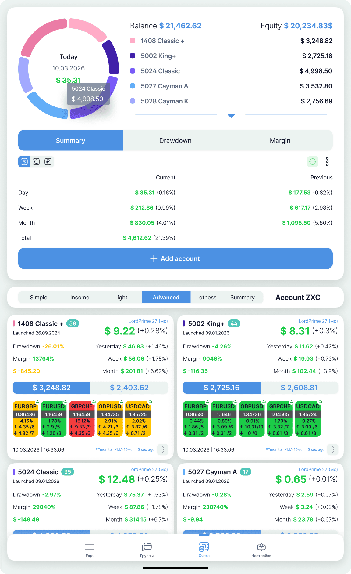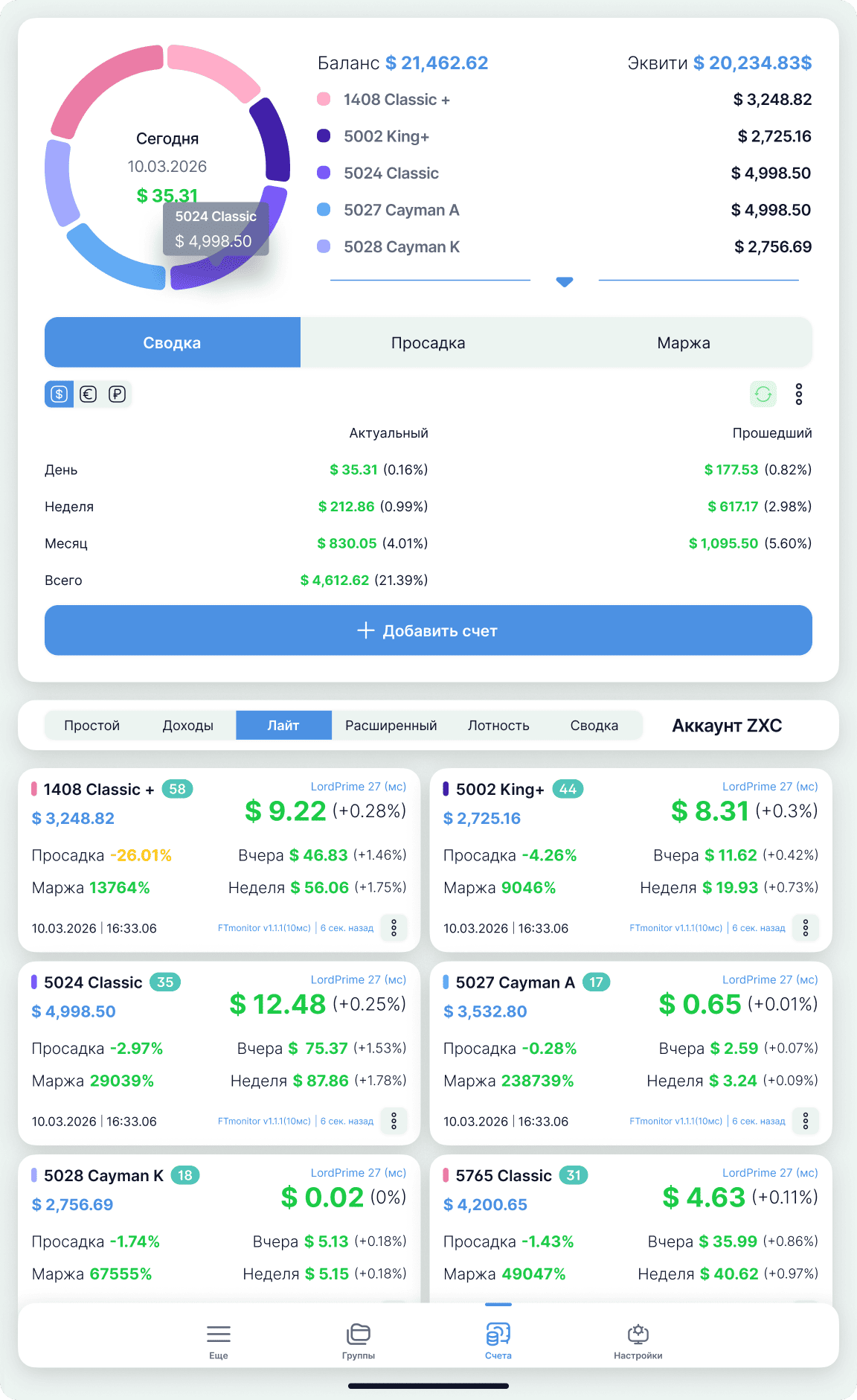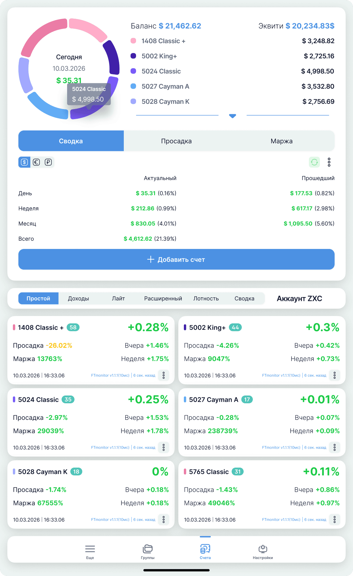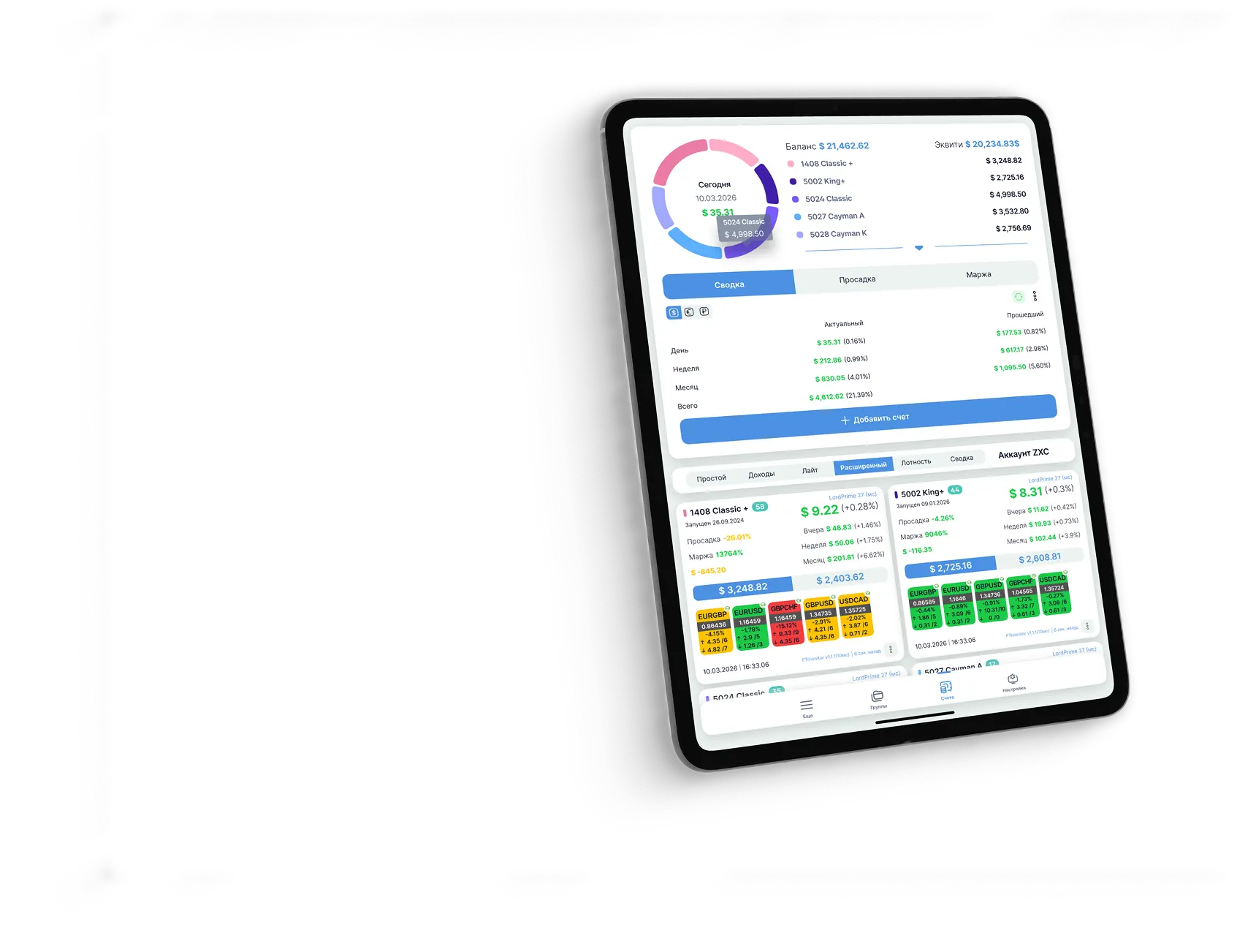 Система мгновенно пересчитывает баланс, эквити и текущую прибыль в удобную для вас валюту по актуальному рыночному курсу
