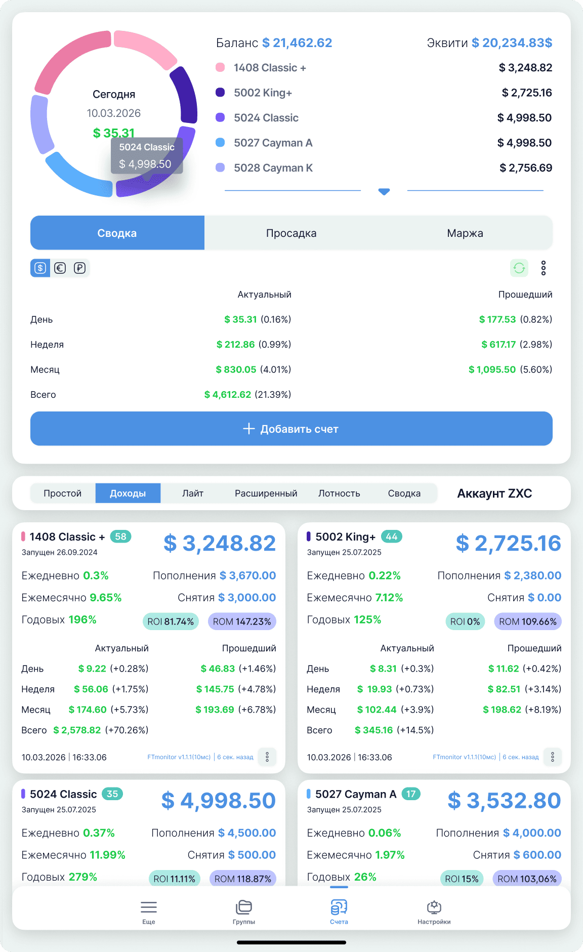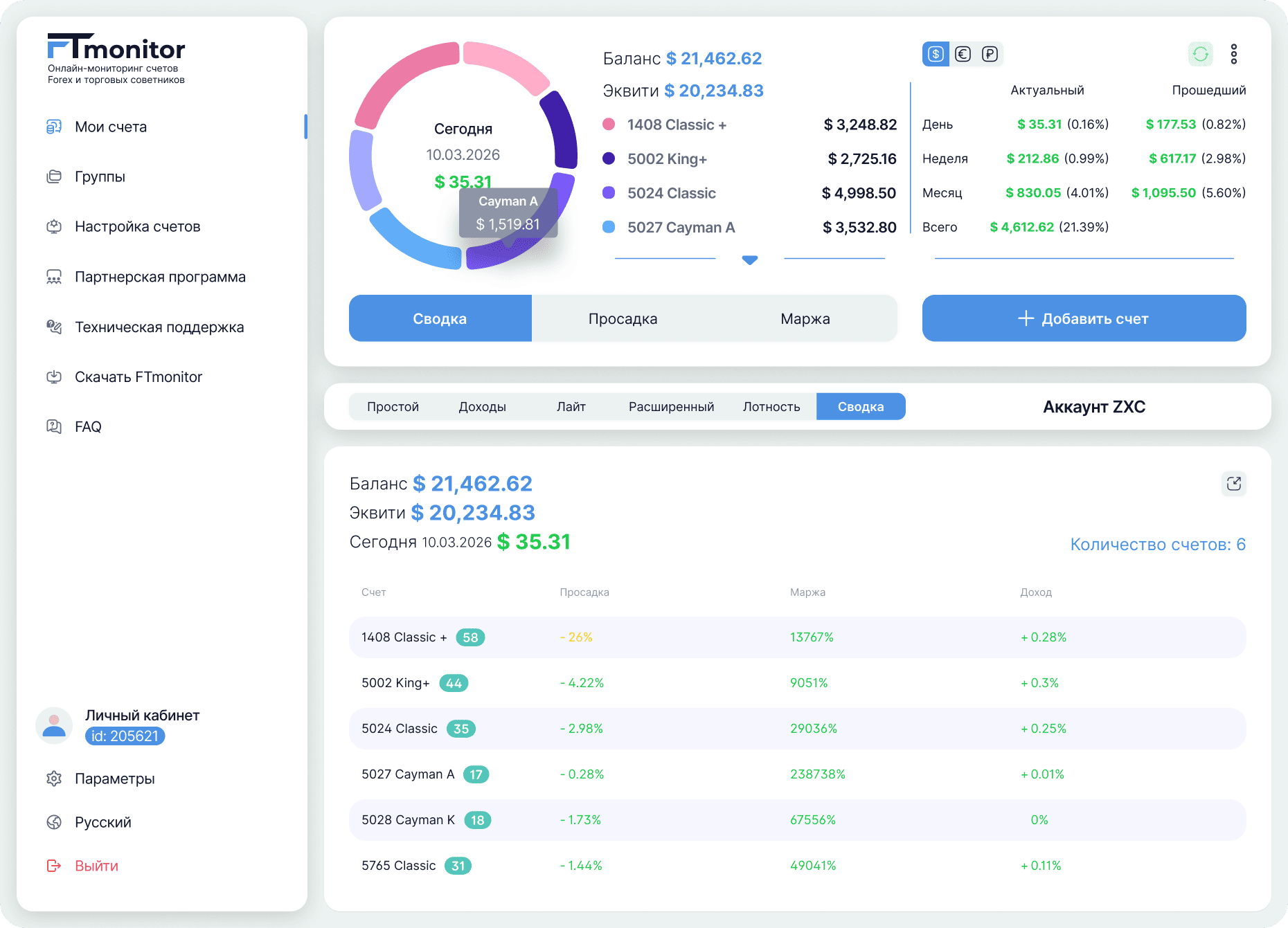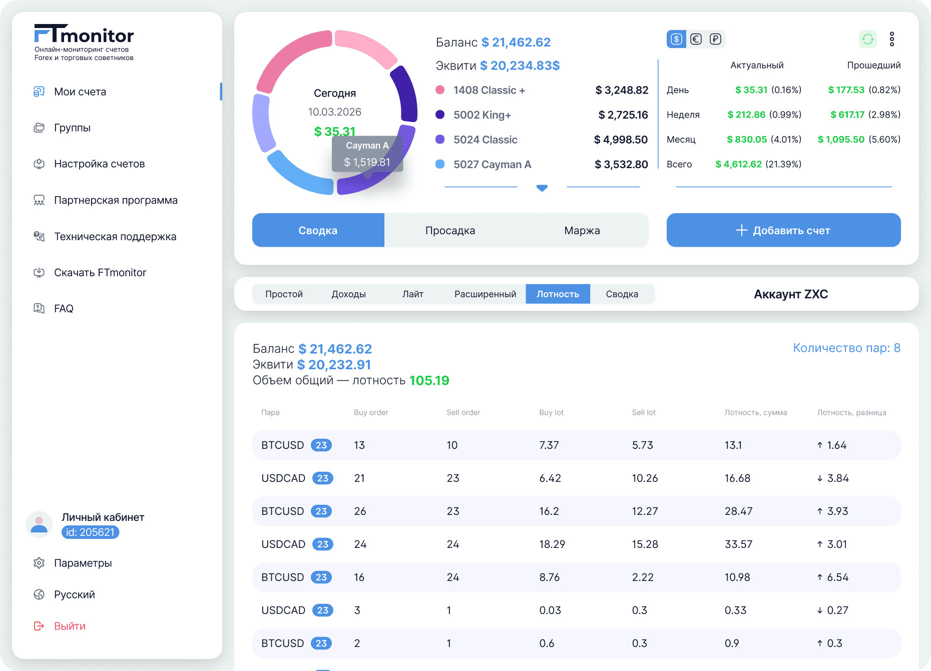 Система мгновенно пересчитывает баланс, эквити и текущую прибыль в удобную для вас валюту по актуальному рыночному курсу