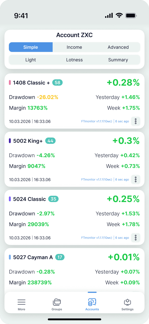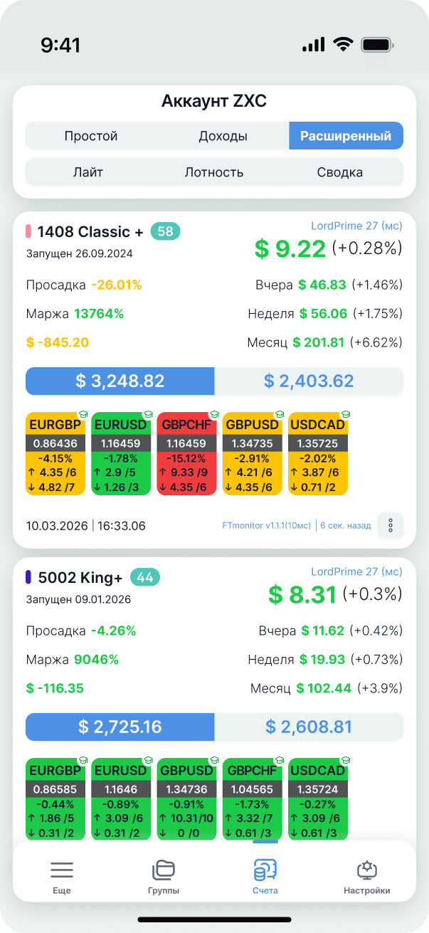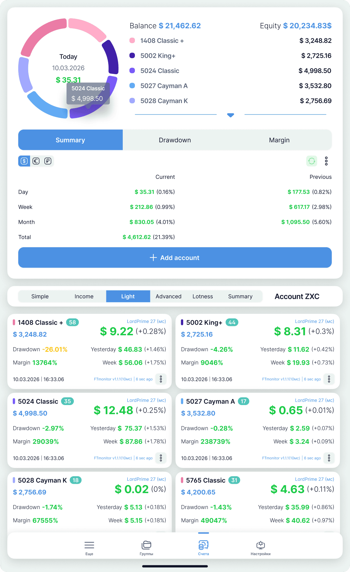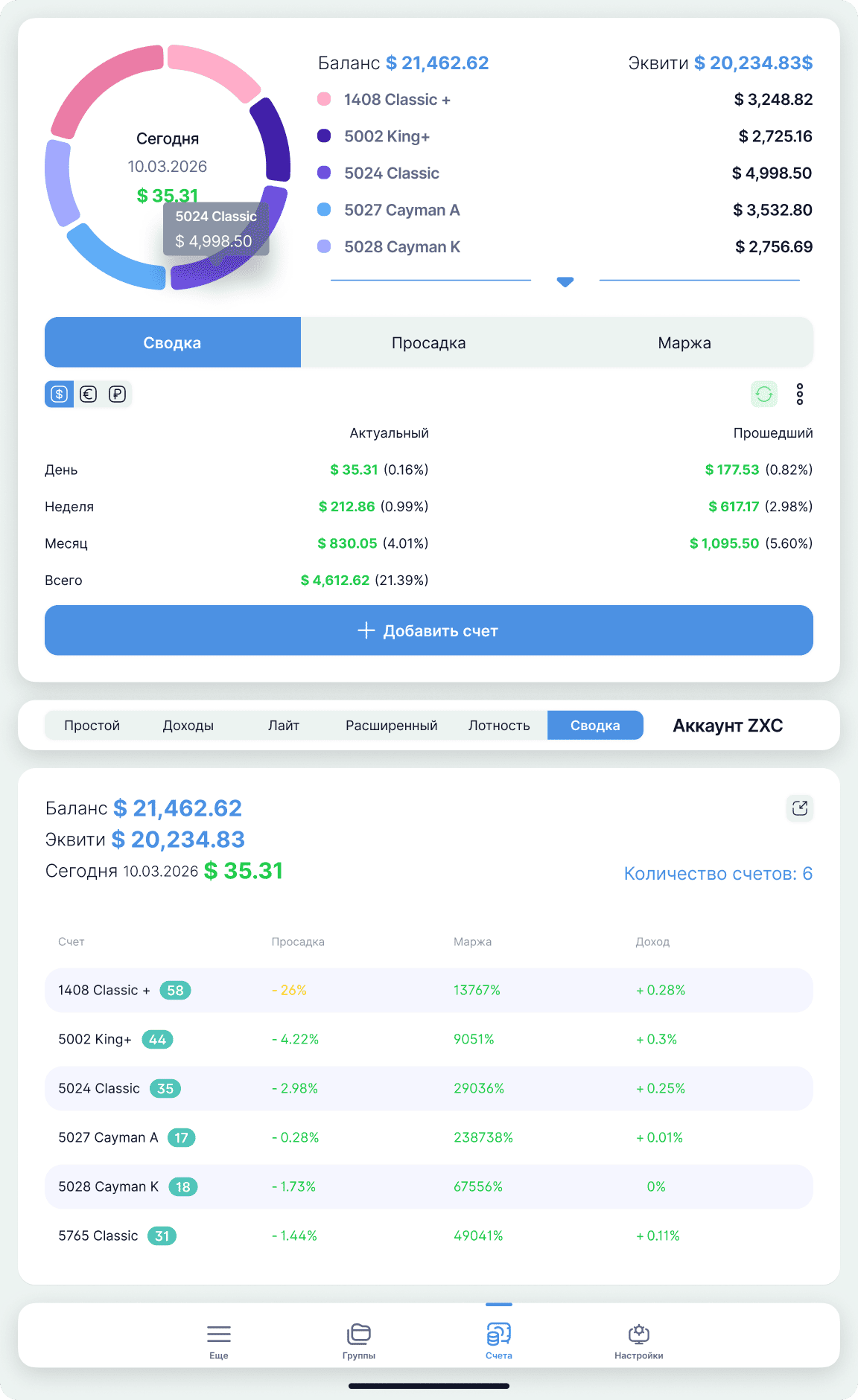 Объединяйте счета в категории или создавайте общие папки для наблюдения за торговыми результатами коллег и друзей