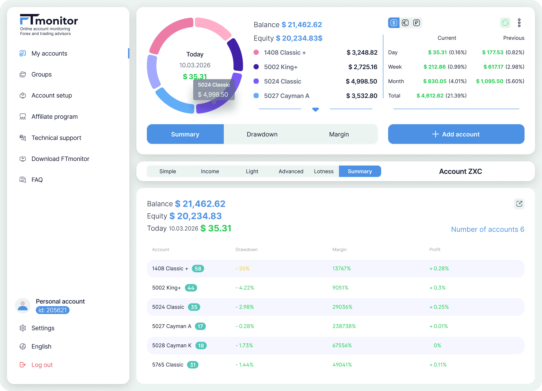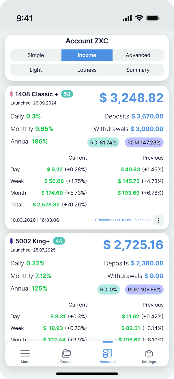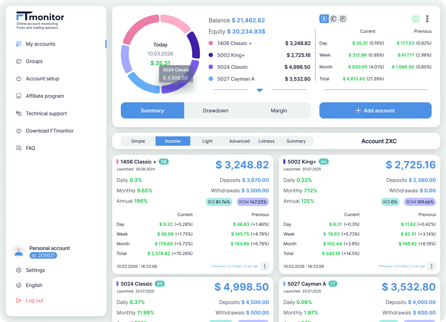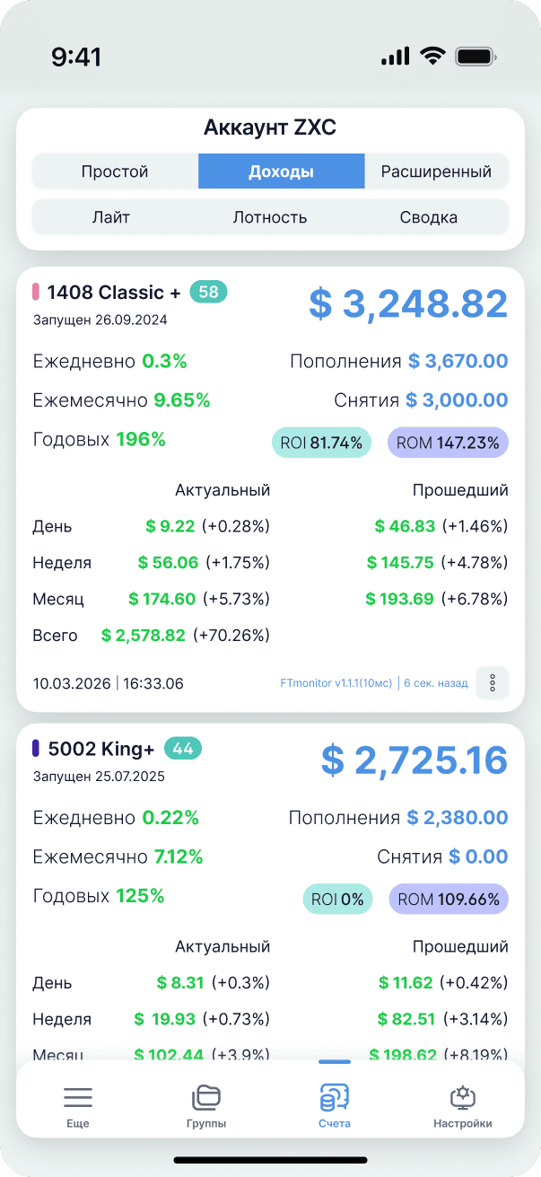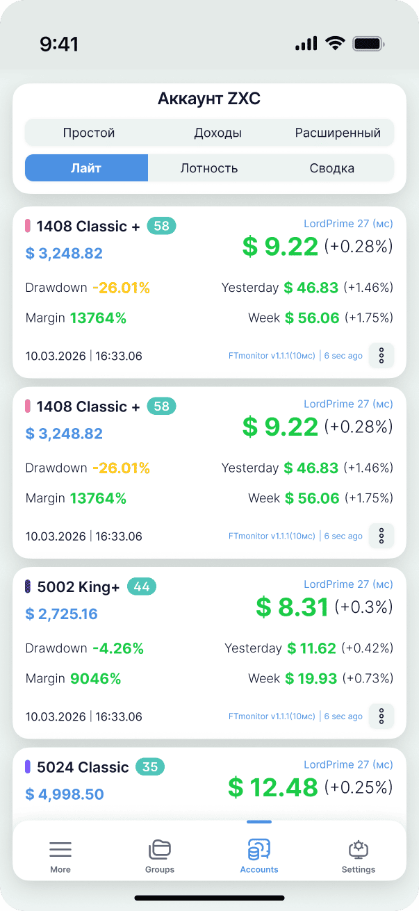 Объединяйте счета в категории или создавайте общие папки для наблюдения за торговыми результатами коллег и друзей
